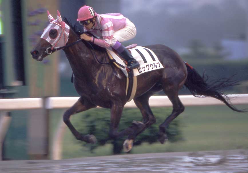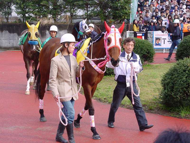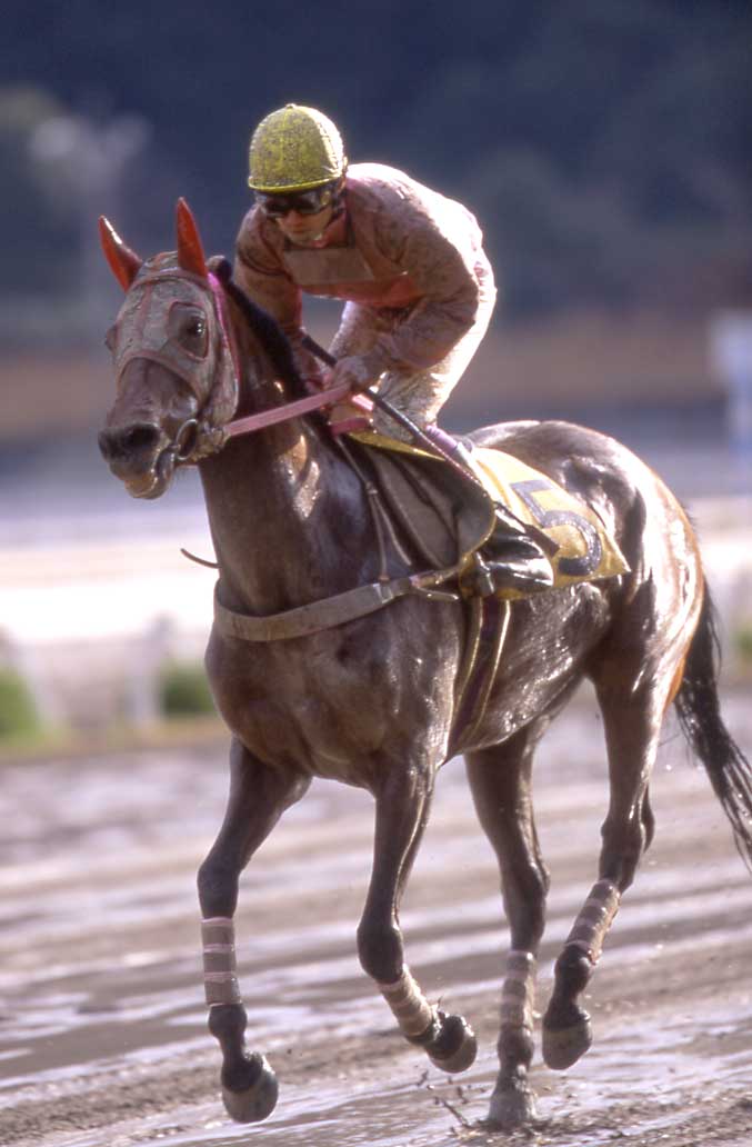 2003年の名古屋優駿を勝ったビッグウルフ号です。 あいにくの雨でドロドロの馬場でしたが、前走同様しっかりと差しきって勝ちました。 この後もGIを勝ちましたし、古馬になってからの活躍に期待したいところですね。 |